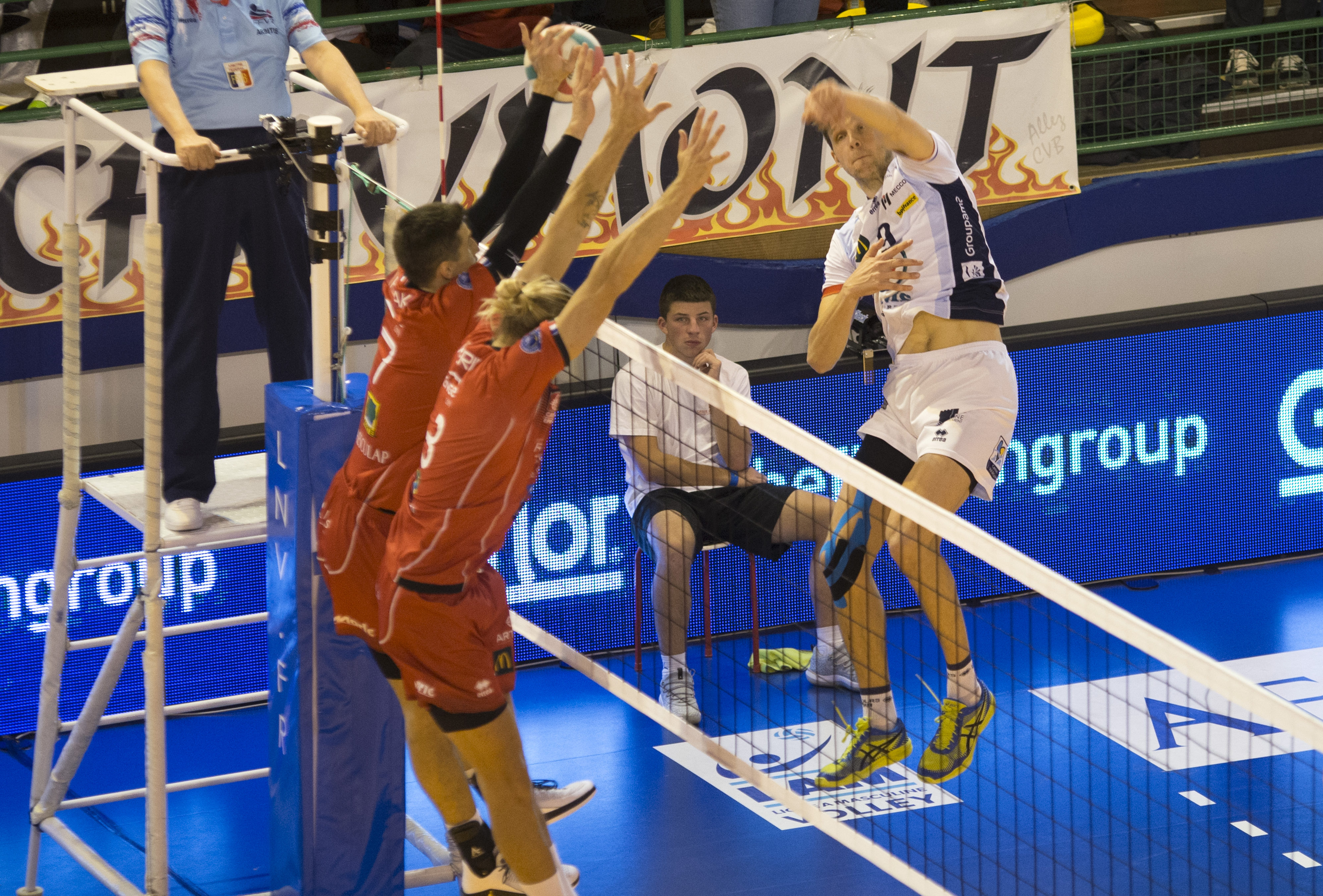 Mais après la pause entre le 2e et le 3e set, les Rouges seront moins précis, moins efficaces offensivement. Et le TVB, par l’intermédiaire de Nathan Wounembaina et Barthélémy Chinenyeze notamment, prendra le dessus dans cette 3e manche. 19 – 25 au tableau d’affichage, les deux équipes partent donc pour un 4e set. Un 4e set plus proche dans le contenu des deux premiers, mais avec la même issue que le 3e. Serré et tendu, ce 4e set verra le CVB mener 24-22 et avoir la possibilité par deux fois de conclure le match. Le champion en titre sauvera ces deux points pour s’imposer finalement 26 – 28, ne laissant pas passer l’occasion d’aller disputer un tie break étouffant dans l’enfer de Jean Masson.