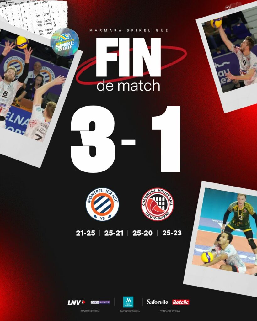 Le MHSC viendra profiter d’une faute directe de Bracko pour prendre un break, 23-21, qu’il ne lâchera plus malgré la belle résistance chaumontaise, 25-23.