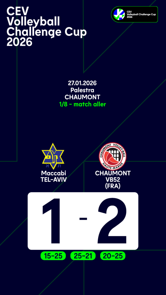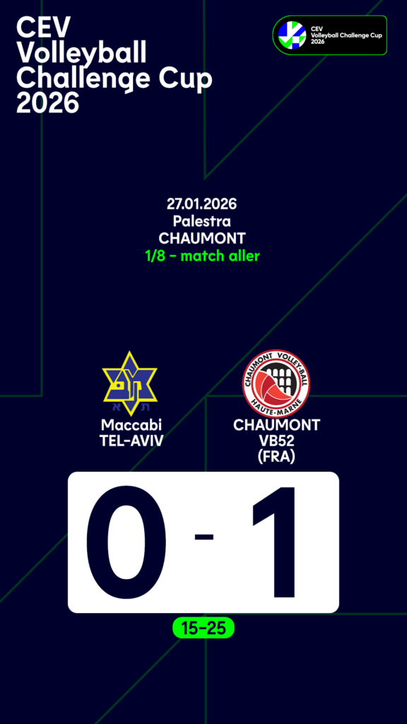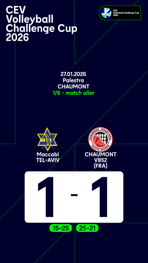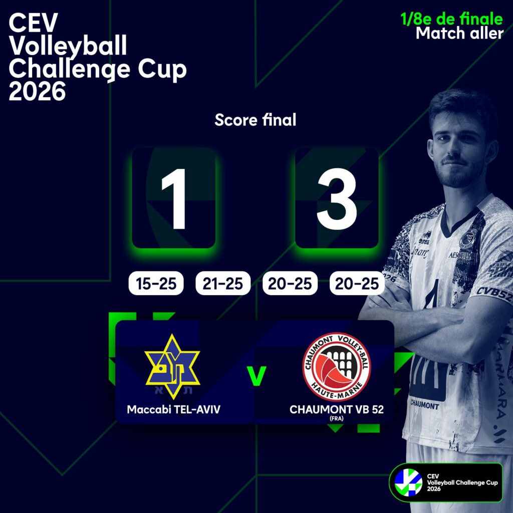 Pour son entrée en lice en huitièmes de finale de la CEV Challenge Cup 2026, le CVB52 s’impose 1-3 face au Maccabi Tel-Aviv lors du match aller. Très solides dès le premier set, les Chaumontais ont su reprendre le contrôle après l’égalisation du Maccabi, portés par une montée en puissance collective et des choix payants du banc. Un succès important avant le match retour à Palestra également, et ce, dès demain.