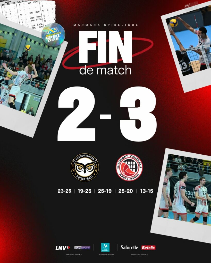Souvent malheureux au tie-break cette saison, le CVB52 a cette fois su inverser la tendance en s’imposant 2-3 sur le terrain du Plessis-Robinson. Après deux sets maîtrisés puis deux trous d’air coûteux, les Chaumontais ont fait preuve de caractère pour conclure l’ultime manche. Une victoire précieuse, d’autant plus que Saint-Nazaire et Ajaccio repartent sans point sur cette journée, offrant un peu d’air au CVB52 au classement.