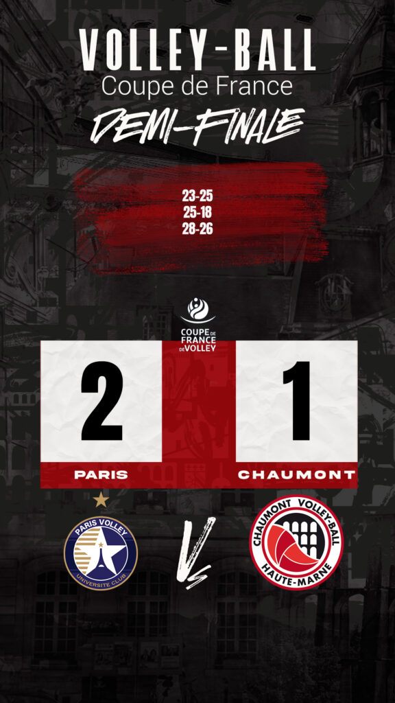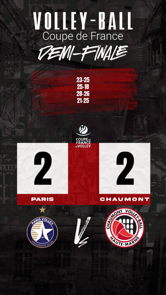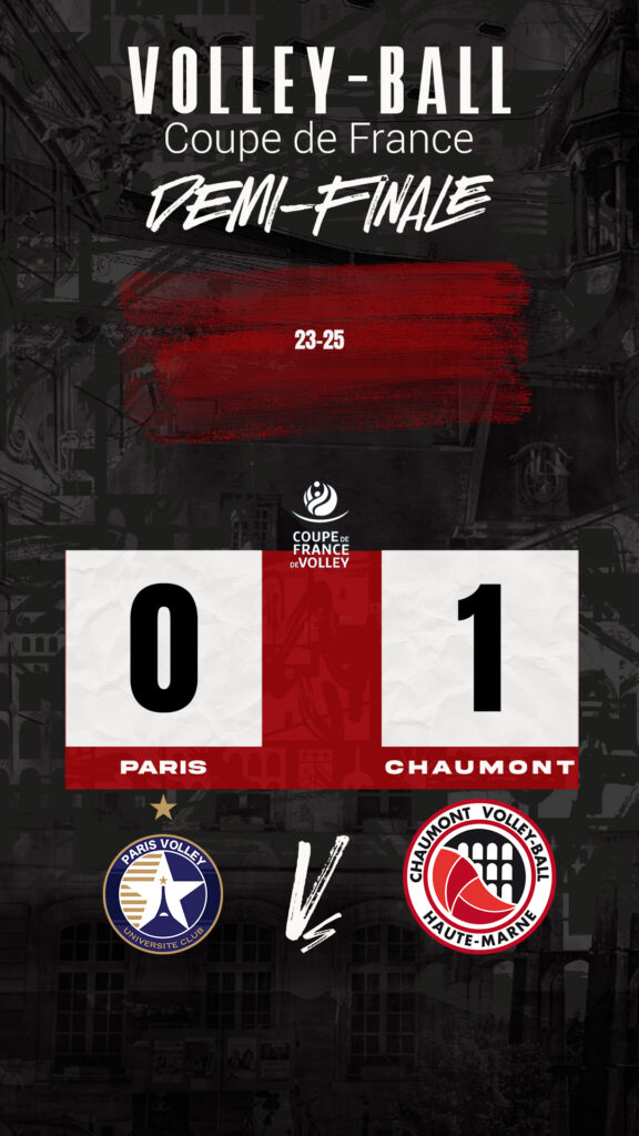 Au terme d’un match intense et spectaculaire, le CVB52 s’incline au tie-break face à Paris et voit s’envoler son rêve de finale de Coupe de France. Portés par un Pierre Toledo retrouvé, les Chaumontais ont su revenir à hauteur après avoir été menés, pousser la rencontre jusqu’au set décisif, mais ont fini par céder face au réalisme parisien. Une élimination cruelle après une prestation engagée.