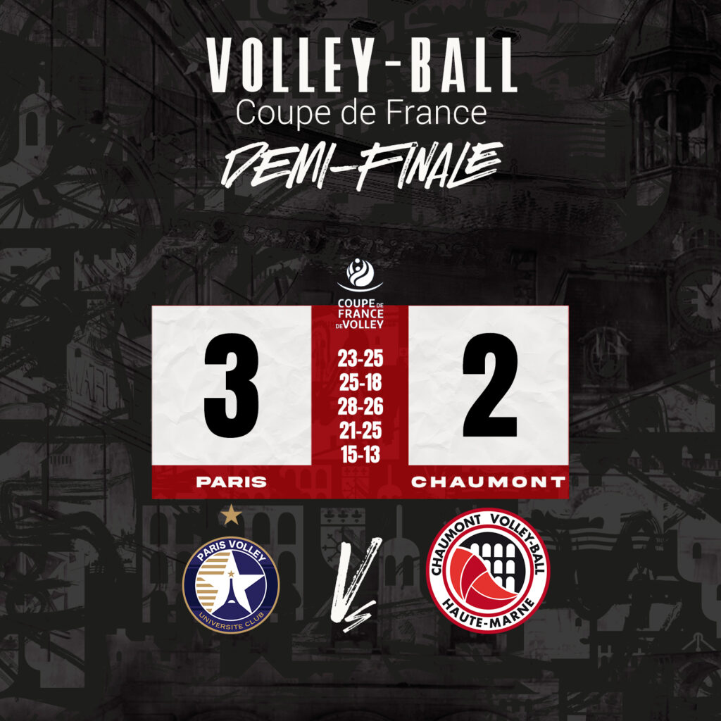 Au terme d’un match intense et spectaculaire, le CVB52 s’incline au tie-break face à Paris et voit s’envoler son rêve de finale de Coupe de France. Portés par un Pierre Toledo retrouvé, les Chaumontais ont su revenir à hauteur après avoir été menés, pousser la rencontre jusqu’au set décisif, mais ont fini par céder face au réalisme parisien. Une élimination cruelle après une prestation engagée.